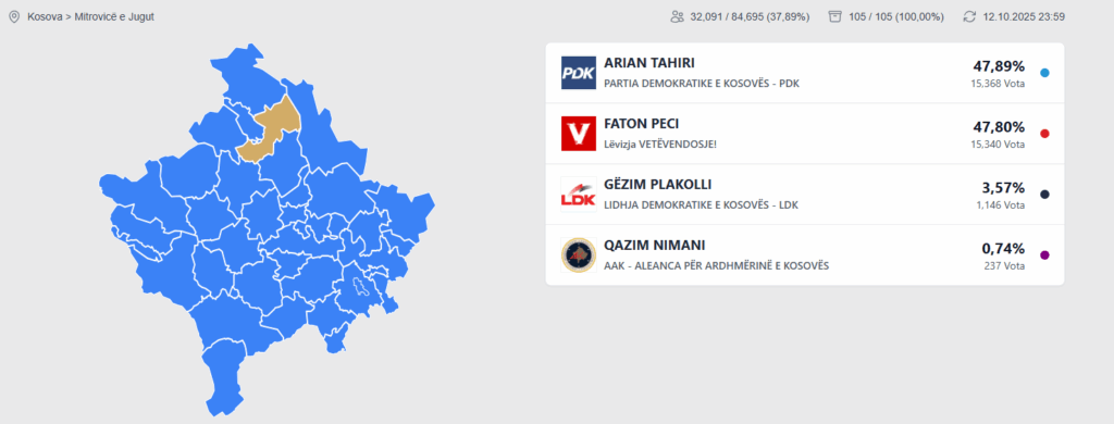The current frontrunner is Arian Tahiri, candidate of the Democratic Party of Kosovo (PDK), followed closely by Faton Peci of Lëvizja Vetëvendosje (LVV).