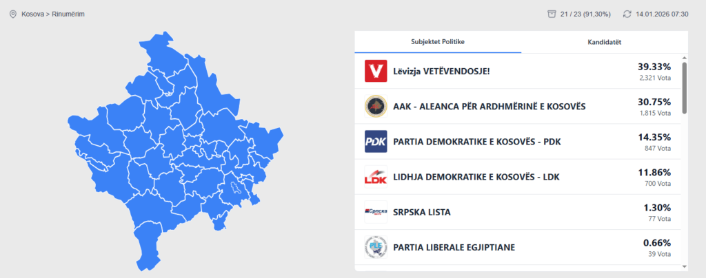 Based on the published data, the Self-Determination Movement (Vetëvendosje) is leading with 2,321 votes (39.33%), followed by the Alliance for the Future of Kosovo (AAK) with 1,815 votes (30.75%), reports IndeksOnline.