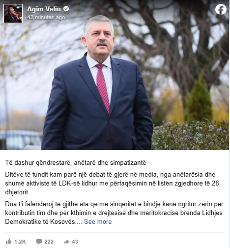 Agim Veliu, from the Democratic League of Kosovo (LDK), addressed the discussions regarding his potential inclusion on the party’s candidate list for the parliamentary elections on December 28. Veliu thanked those who voiced support for his contributions to LDK, as well as for “restoring justice and meritocracy within” the party.