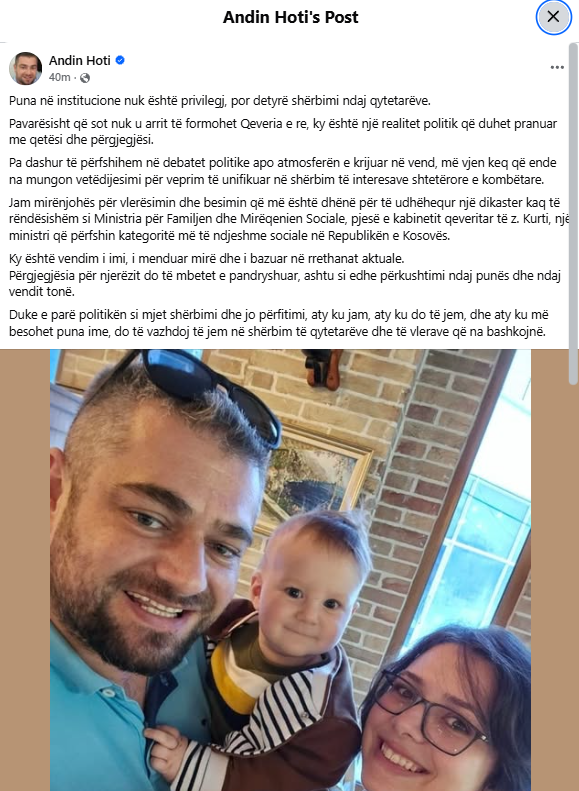 “I am grateful for the trust and appreciation given to me to lead such an important ministry as the Ministry for Family and Social Welfare, part of Prime Minister Kurti’s cabinet — a ministry that includes some of the most socially sensitive categories in the Republic of Kosovo. This is my personal decision, carefully considered and based on the current circumstances. The responsibility toward people will remain unchanged, as will my commitment to work and to our country,” Hoti wrote.