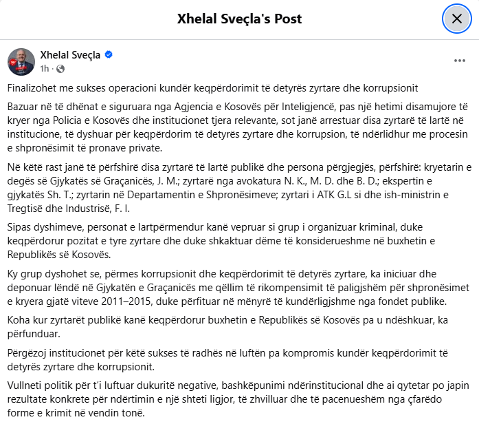 Regarding this operation, Acting Minister of Internal Affairs, Xhelal Sveçla, stated that the action was successfully carried out by the Kosovo Police in cooperation with the Kosovo Intelligence Agency (AKI) and other relevant institutions.