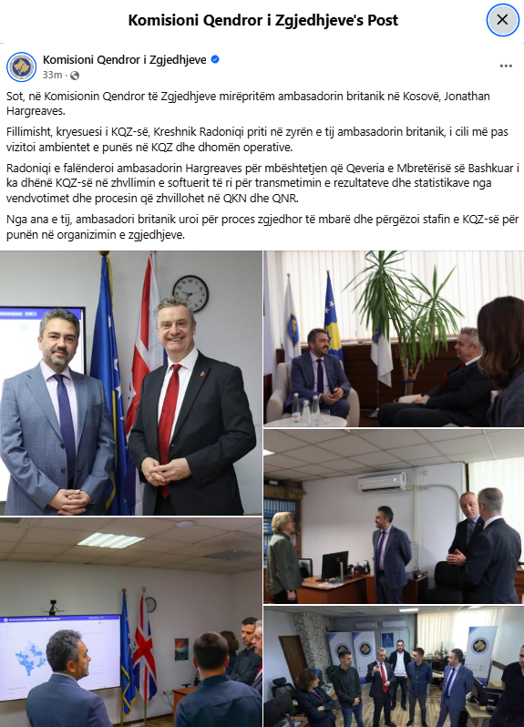 In a statement, the CEC noted that Radoniqi thanked the ambassador for the UK government’s ongoing support, particularly in developing new software for transmitting results and statistics from polling stations, as well as for improving processes in the Control Center and the Counting and Results Center.