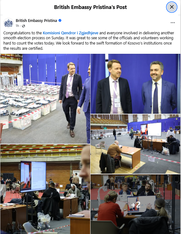 The British Embassy in Kosovo has congratulated the Central Election Commission (CEC) and all those involved in delivering “another well-managed electoral process on Sunday.”