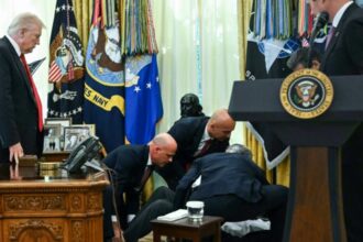 A representative of a pharmaceutical company collapses during Trump’s press conference in the Oval Office