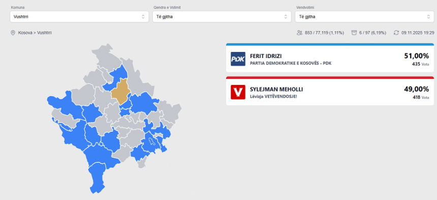 In Vushtrri, six polling stations have been counted so far, revealing a very close race between the two candidates, according to Reporteri.net.