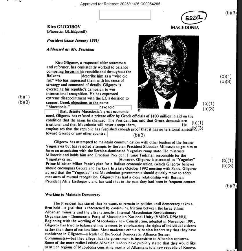 Domestically, the CIA report states that Gligorov tried to balance ethnic tensions, particularly between the Macedonian majority and the Albanian community, while working to stabilize the country during the turbulent post-Yugoslav transition.