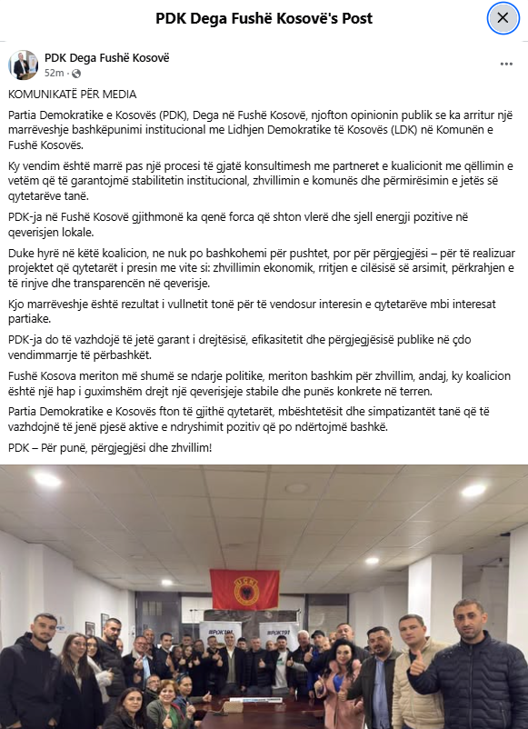 The Democratic Party of Kosovo (PDK) branch in Fushë Kosovë has announced that it has reached an institutional cooperation agreement with the Democratic League of Kosovo (LDK) in the municipality.