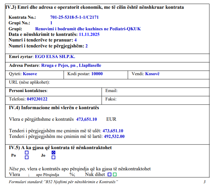 The tender procedure was open, and the financing will be provided through the consolidated budget of the Republic of Kosovo.