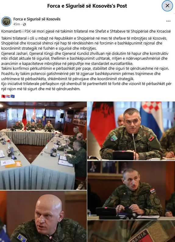 The trilateral meeting held in the Republic of Albania between the Chiefs of Defense of Kosovo, Albania, and Croatia marked an important step in strengthening regional cooperation and strategic coordination in the field of security and defense.