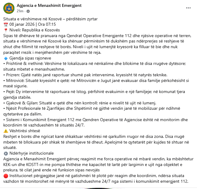 🔴 Responsible institutions are fully on alert and continue to monitor the situation 24/7 through the emergency communication system 112.