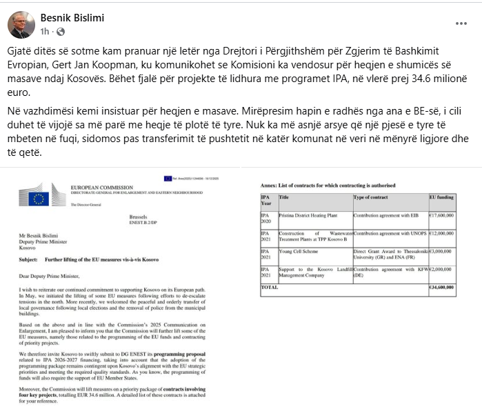 Acting Deputy Prime Minister Besnik Bislimi has announced that he received a letter today from the Director-General for EU Enlargement, Gert Jan Koopman, informing him that the European Commission has decided to lift the majority of the measures imposed on Kosovo.