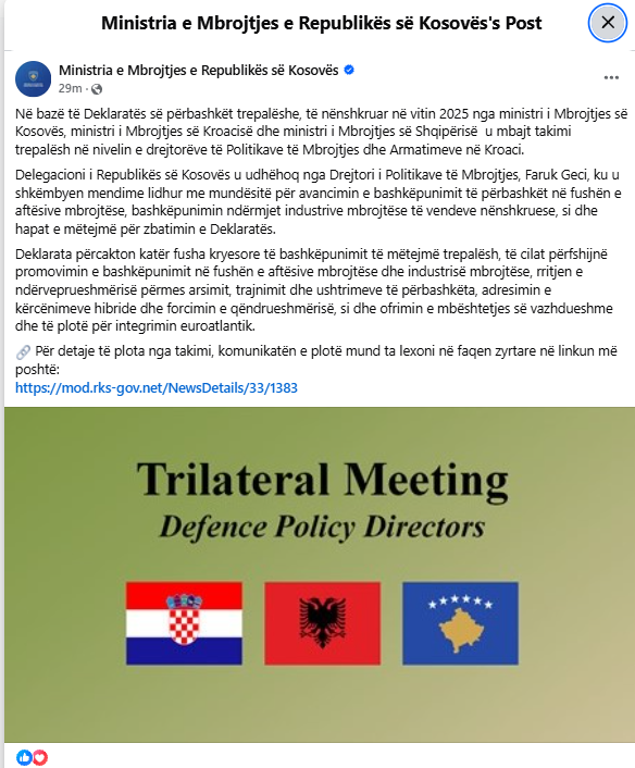As part of the implementation of the Joint Trilateral Declaration signed in 2025, the first Kosovo–Albania–Croatia trilateral meeting was held today at the level of Directors of Defense Policy and Armaments.