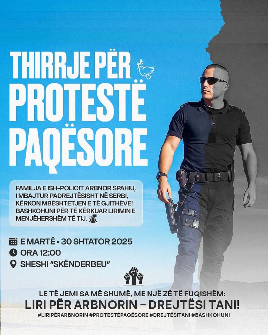 “On behalf of the Spahiu family, we inform you that tomorrow, September 30, 2025, at 12:00 p.m., a peaceful protest will be organized in support of former police officer Arbnor Spahiu, who is being unjustly held in detention in Serbia.”