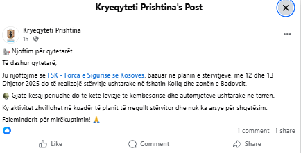 The Municipality of Prishtina has announced that on December 12 and 13, the Kosovo Security Force (FSK) will conduct military training in the village of Koliq and the Badovc area.