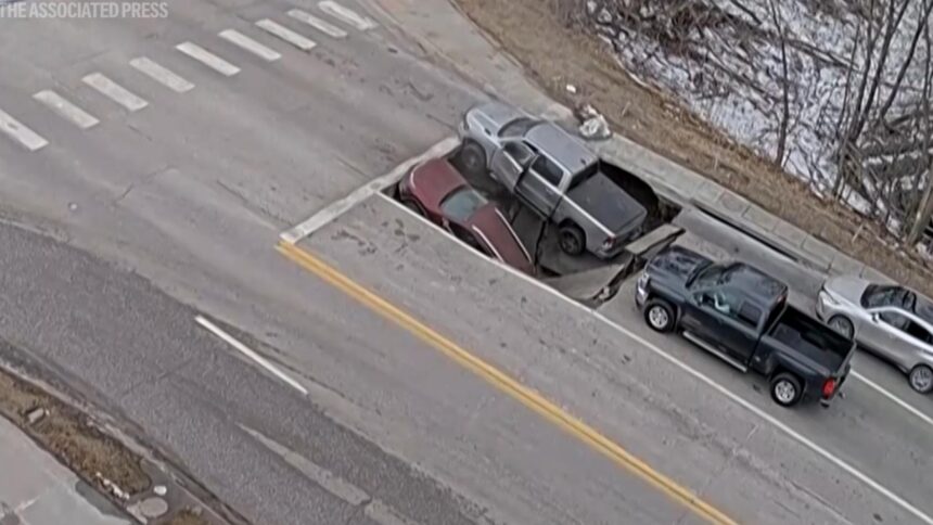 A sudden sinkhole opened up on the streets of Omaha, Nebraska, swallowing two vehicles that were waiting at a traffic light.
