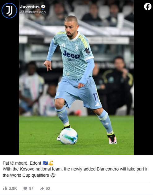 “Fat të mbarë, Edon! With the Kosovo national team, the newest Bianconeri player will take part in the World Cup qualifiers,” wrote the Turin-based club.