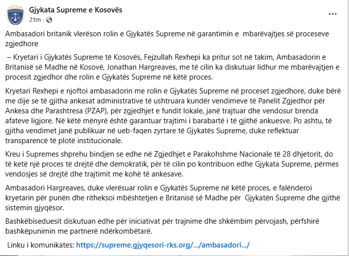 “President Rexhepi briefed the ambassador on the Supreme Court’s role in electoral processes, noting that all administrative appeals against PZAP decisions regarding the recent local elections were handled and decided within legal timeframes. This ensured equal treatment for all complainants. Furthermore, all decisions were published on the Supreme Court’s official website, reflecting full institutional transparency. The Supreme Court President expressed confidence that the upcoming early national elections on December 28 will also be fair and democratic, with the Court contributing through timely and proper adjudication of appeals,” the statement read.