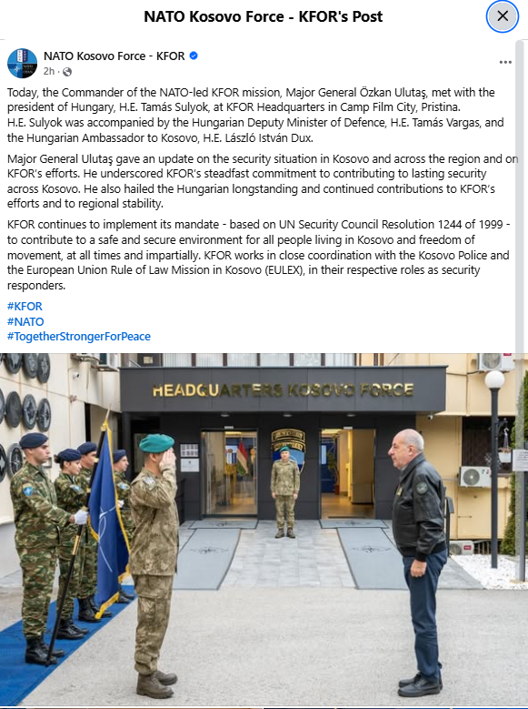 “Major General Ulutash provided an update on the security situation in Kosovo and across the region, as well as on KFOR’s ongoing efforts. He emphasized KFOR’s unwavering commitment to contributing to sustainable security throughout Kosovo. He also acknowledged Hungary’s long-standing and continuous contributions to KFOR’s efforts and regional stability,” KFOR stated.