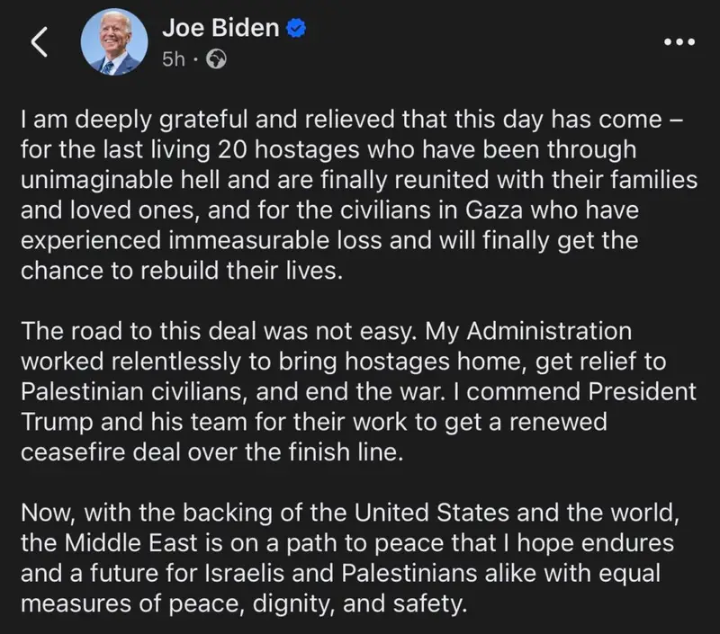 U.S. President Joe Biden has expressed gratitude following the new agreement that enabled the release of 20 hostages and paved the way toward peace in the Middle East.