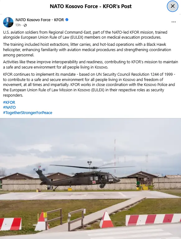 According to KFOR, the training included hoist extraction operations, casualty transport, and hot-loading procedures using a Black Hawk helicopter, enhancing familiarity with aviation medical procedures and strengthening coordination among personnel.