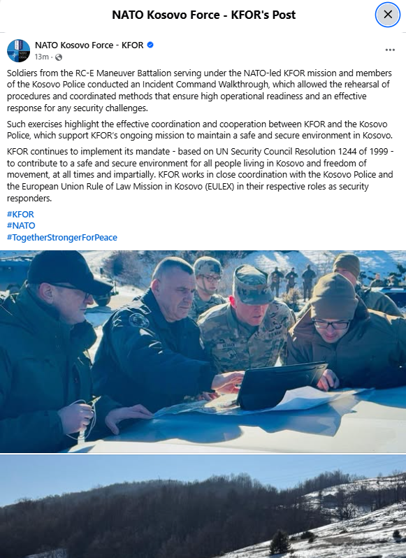 Such exercises emphasize the coordination and effective cooperation between KFOR and the Kosovo Police, supporting KFOR’s ongoing mission to maintain a safe and stable environment in Kosovo.
