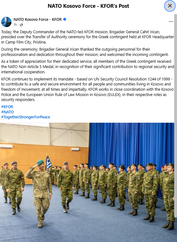 As a token of appreciation for their committed service, all members of the Greek contingent were awarded the NATO Non-Article 5 medal, recognizing their contribution to regional security and international cooperation.