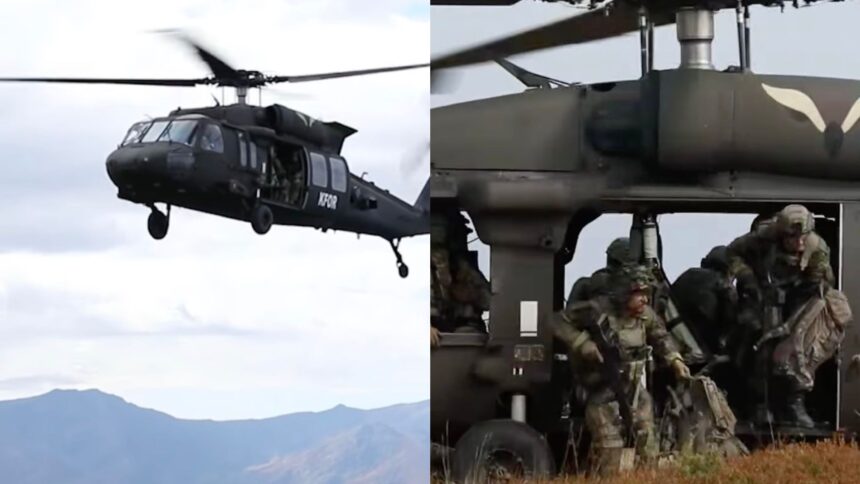 According to KFOR’s statement, UH-60 Black Hawk helicopters were used to deploy troops in support of an independent patrol mission, improving rapid air mobility, disembarkation procedures, and coordination between infantry, aviation, and EOD teams.