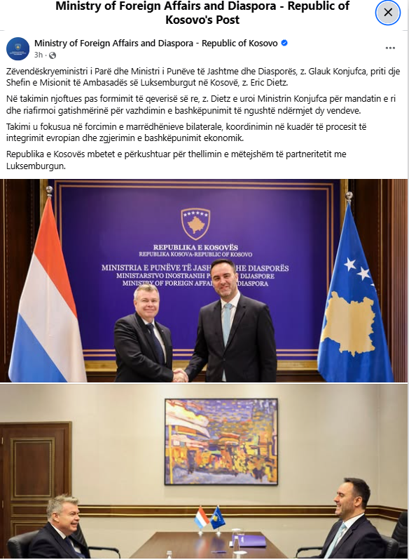 First Deputy Prime Minister and Minister of Foreign Affairs and Diaspora, Glauk Konjufca, on Thursday received Eric Dietz, Head of Mission of the Embassy of Luxembourg in Kosovo.