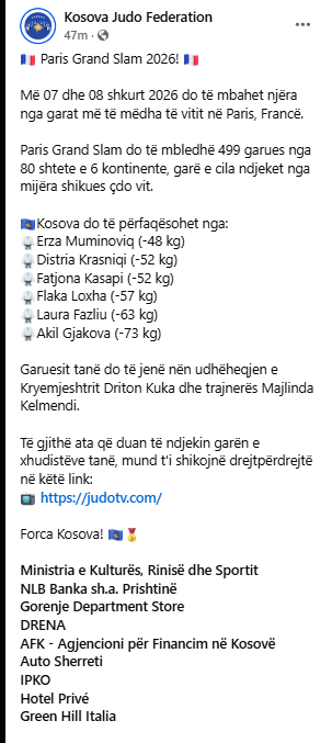 The Paris Grand Slam 2026 is not only a major test for Kosovo’s judokas but also a real opportunity for medals and further recognition of Kosovo in the global sports arena.