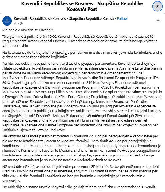 On Thursday, April 2, at 10:00 AM, the Assembly of the Republic of Kosovo will convene for a regular plenary session, the Assembly Presidency decided at today’s meeting.