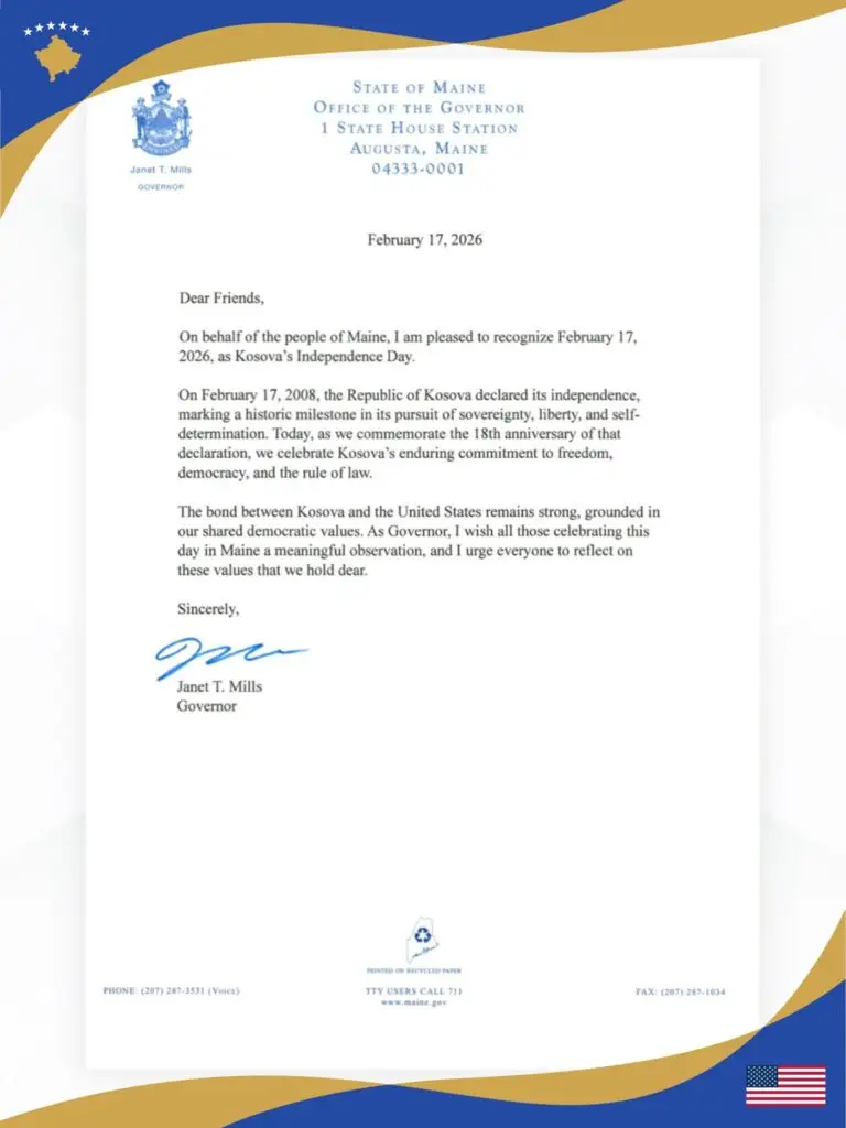 The Embassy of Kosovo in the United States has expressed gratitude to Governor Janet Mills of Maine for officially recognizing February 17th as Kosovo Independence Day in the state.