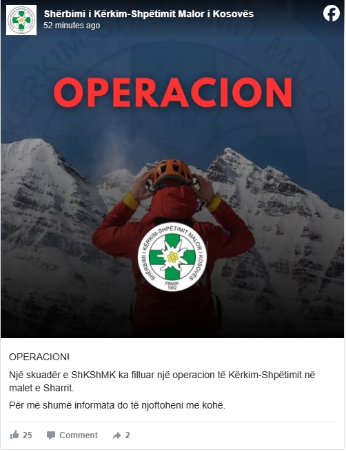 “A team from ShKShMK has initiated a search and rescue operation in the Sharr Mountains. Further information will be provided in due time,” the announcement reads.