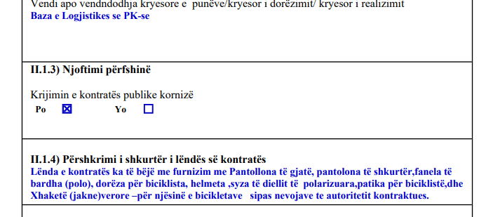 “The subject of the contract concerns the supply of long trousers, shorts, white shirts (polo), cyclist gloves, helmets, polarized sunglasses, cycling shoes, and summer jackets for the Bicycle Unit according to the needs of the contracting authority.”