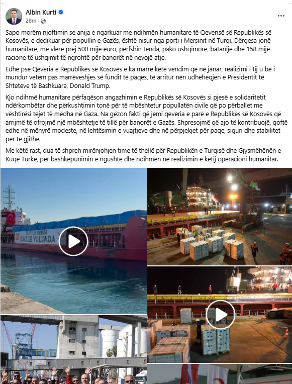 “We just received notification that the ship carrying humanitarian aid from the Government of the Republic of Kosovo, dedicated to the people of Gaza, has departed from the port of Mersin in Turkey. Our humanitarian shipment, valued at €500,000, includes tents, food packages, blankets, and 158,000 hot meal rations for the residents in need,” Kurti wrote on Facebook.