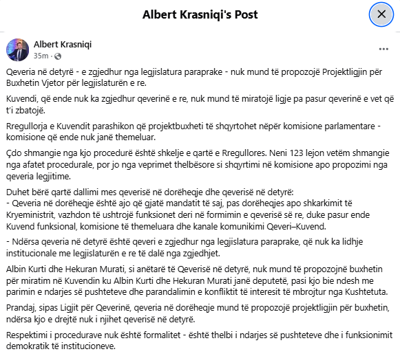 Political analyst Albert Krasniqi has clarified that the caretaker government, elected by the previous legislature, does not have the legal authority to propose the Annual Budget Bill for the new legislature.