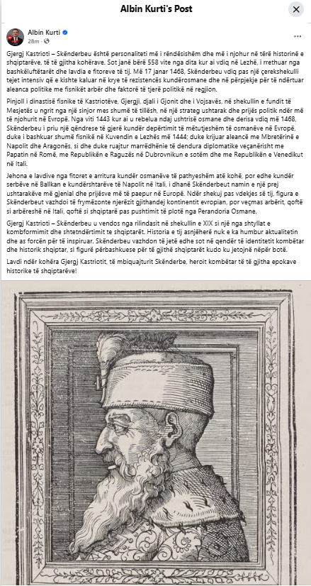 “The echoes of his victories against the then-invincible Ottomans, as well as against the Serbs in the Balkans and opponents in Naples, earned Skanderbeg the reputation of one of the most brilliant military minds and relentless leaders in Europe. Centuries after his death, his figure continued to inspire people across the continent, especially the Arbëresh in Italy and Albanians under Ottoman rule,” Kurti wrote.