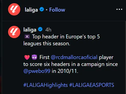 “The Dardanian Pirate has scored six headed goals this season with Mallorca, becoming the first to reach this mark since Pierre Webo in 2010/11,” La Liga wrote.
