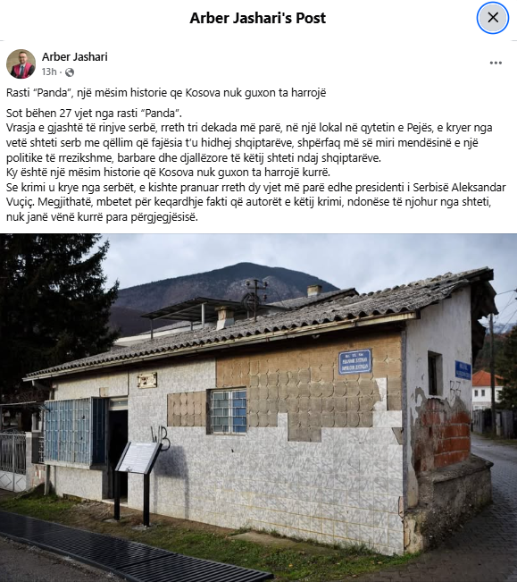“The ‘Panda’ case is a historical lesson that Kosovo must never forget. Today marks 27 years since the ‘Panda’ case. The murder of six young Serbs, nearly three decades ago, in a café in the city of Peja — carried out by the Serbian state itself with the aim of blaming Albanians — most clearly exposes the mindset of a dangerous, barbaric, and diabolical policy pursued by this state against Albanians. This is a historical lesson that Kosovo must never forget. That the crime was committed by Serbs was acknowledged about two years ago even by the President of Serbia, Aleksandar Vučić. Nevertheless, it remains deeply regrettable that the perpetrators of this crime, although known to the state, have never been brought to justice,” Jashari wrote.