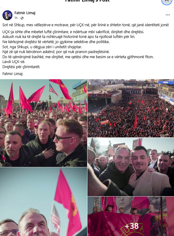The leader of NISMA, Fatmir Limaj, has commented on today’s protest in Skopje, saying he stood alongside brothers and sisters in support of the KLA, freedom, and the state of Kosovo, which he described as core elements of Albanian identity.