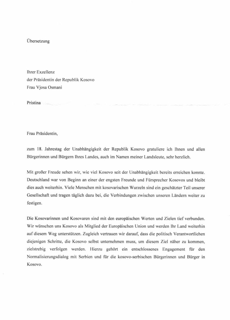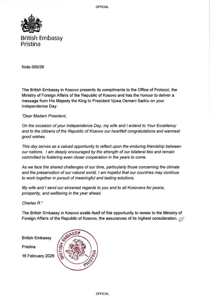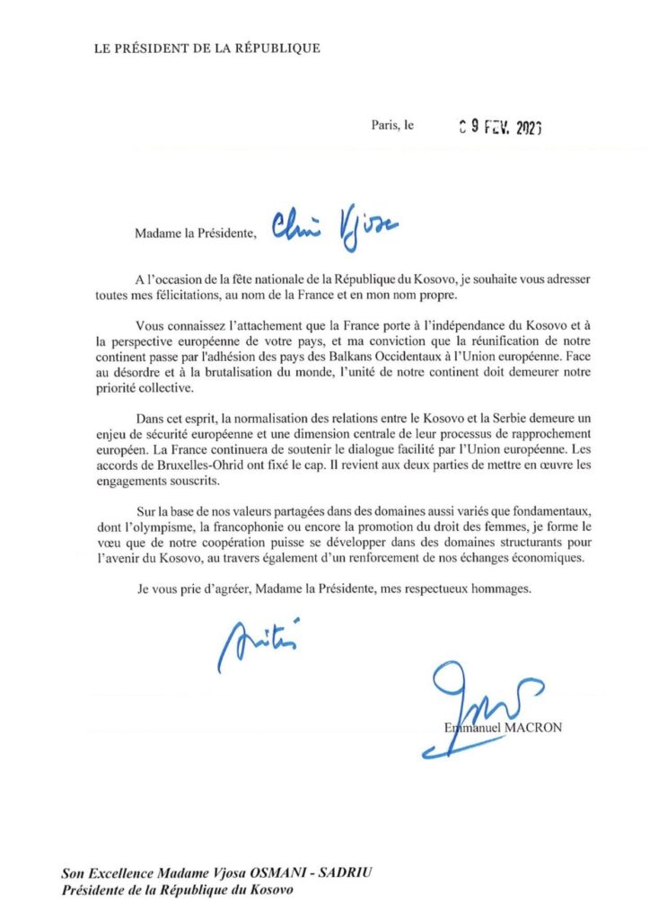 The President of France, Emmanuel Macron, sent a congratulatory letter to President Vjosa Osmani on the occasion of the 18th anniversary of Kosovo’s Independence.