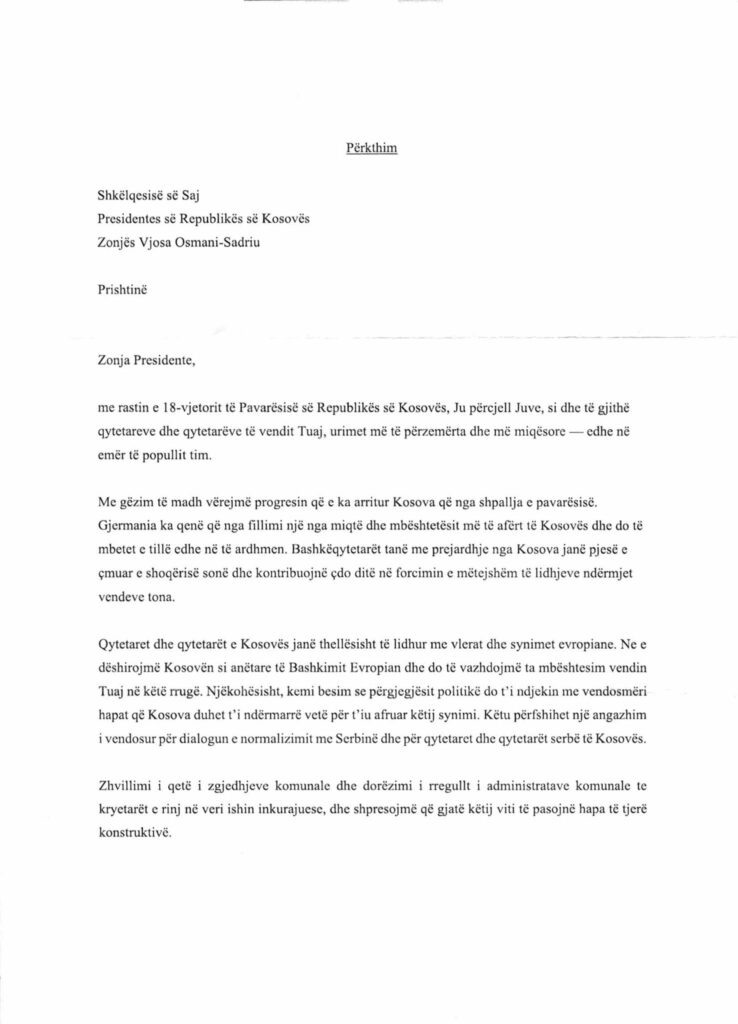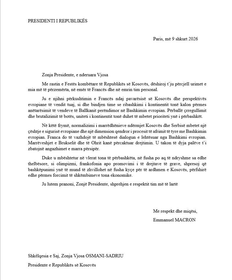 In his letter, Macron emphasized that the normalization of relations between Kosovo and Serbia remains a matter of European security, and that France supports the EU-facilitated dialogue.