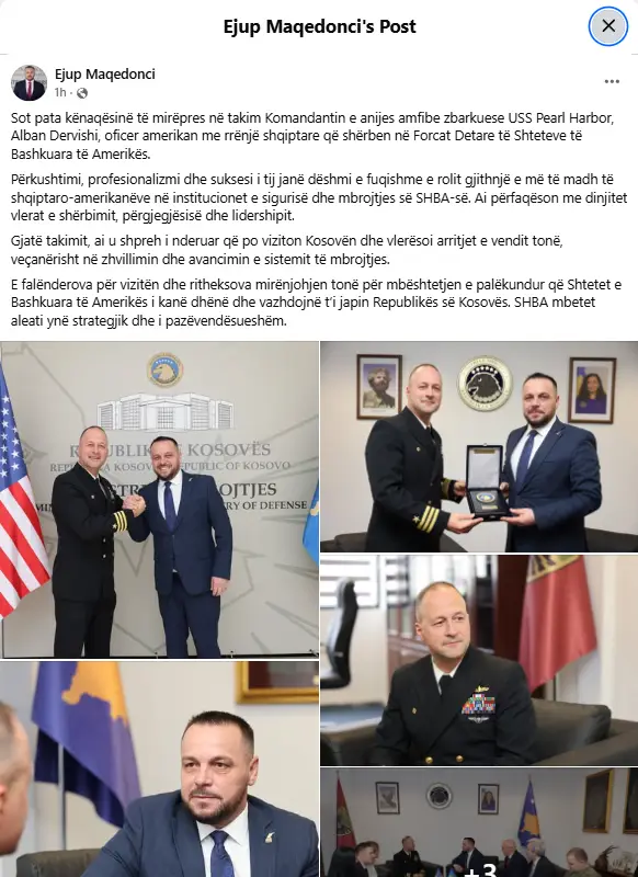 “Today I had the pleasure of welcoming the commander of the amphibious ship USS Pearl Harbor, Alban Dervishi, an American officer of Albanian origin serving in the United States Navy,” Maqedonci wrote.