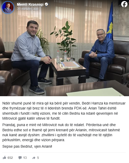 The leader of the Democratic Party of Kosovo (PDK), Memli Krasniqi, praised the contribution of Bedri Hamza to the development of Mitrovica, describing him as a mentor and inspiration for the new generation of party leaders.