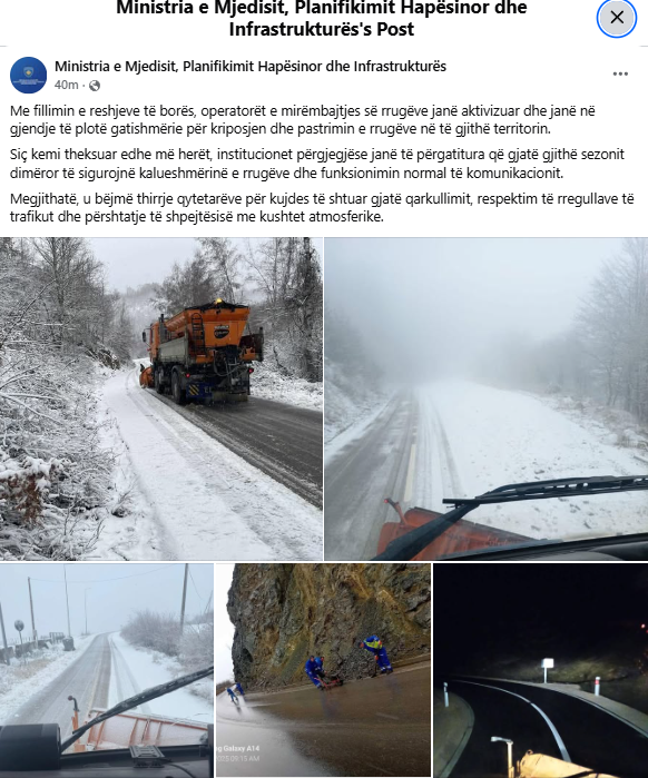 The Ministry of Environment, Spatial Planning and Infrastructure (MESP&I) has announced that, following the onset of snowfall, road maintenance operators have been activated and are on full alert to carry out road salting and snow clearing across the entire territory of Kosovo.