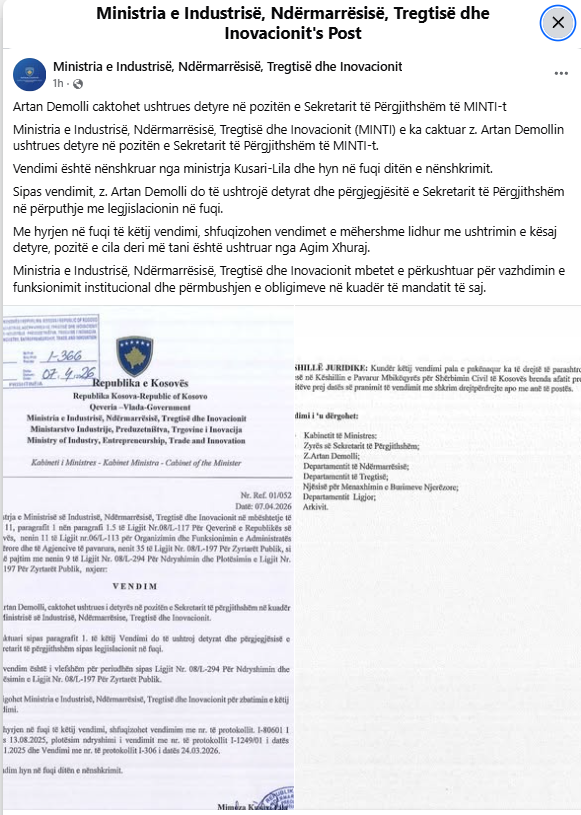 According to the decision, Demolli will carry out the duties and responsibilities of the Secretary General in accordance with current legislation. The ministry emphasizes its commitment to continue institutional operations and fulfill its obligations under its mandate.