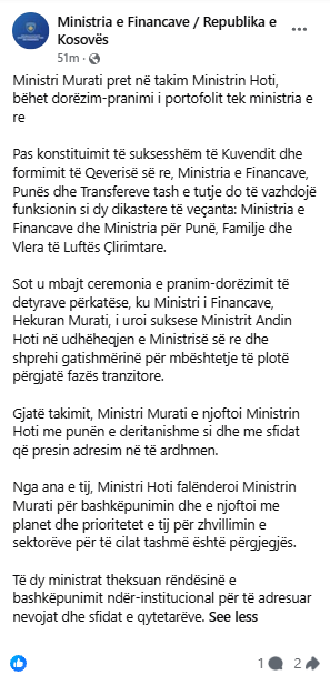 The formal handover of duties took place today, with Minister Murati wishing Minister Hoti success in leading the newly established ministry and expressing his readiness to provide full support during the transitional phase.