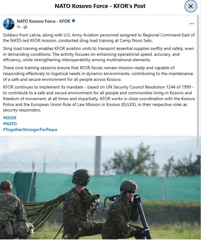 According to the press release, sling-load training enables KFOR aviation units to transport essential supplies quickly and safely — even in challenging conditions.