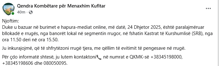 Based on open sources and online media, on December 24, 2025, a road blockade has been announced by local residents on the road segment in the village of Kastrat, Kuršumlija (SRB), from 11:50 AM to 3:50 PM.