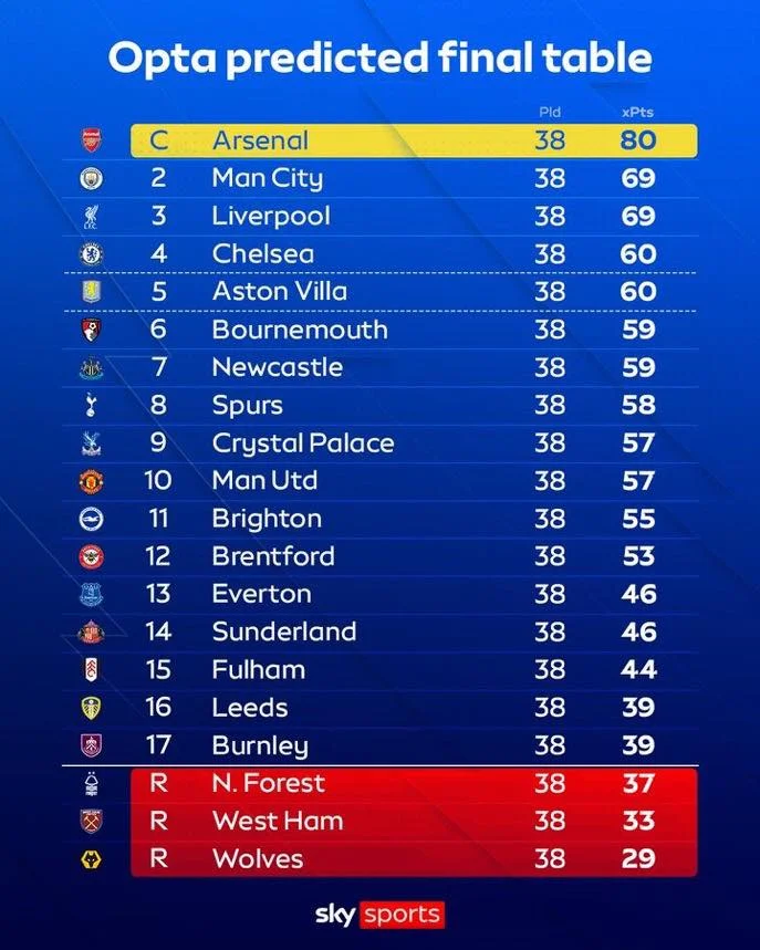 According to their projections, Arsenal will be crowned champions of England with 80 points, leaving behind Manchester City and Liverpool, who are both expected to finish with 69 points each.