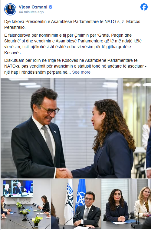 The President of Kosovo, Vjosa Osmani, met yesterday with the President of the NATO Parliamentary Assembly, Marcos Perestrello, to discuss the latest developments in relations between Kosovo and NATO.